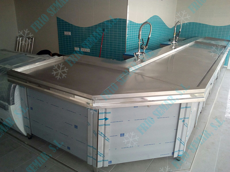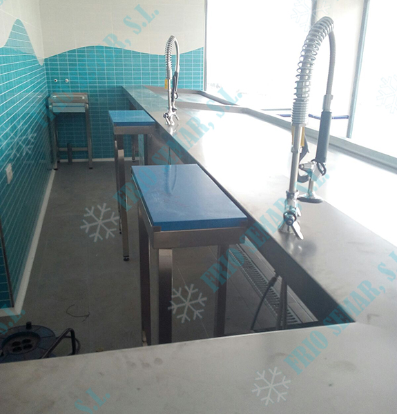 Hoy os traemos imagenes de un montaje que hicimos para una pescadería antes del verano. Consistente en una barra pescadera completa con quiebro, dos tajos de corte, instalación de grifería, lavamanos, pasamanos y colocación de barras para los pesos.
